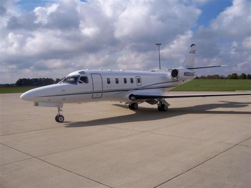 | Exterior: | Painted in 2004 by Duncan Aviation. Matterhorn white w/fighter blue, medium gray & Aristo blue stripes. | |