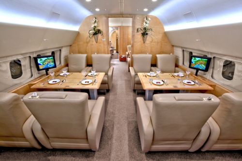 | Interior: | This BBJ has seating for thirty-three (33) passengers. There are four separate cabin areas consisting of a passenger lounge with meeting area, dining and conference suite, private stateroom and a full galley. Forward, just behind the cockpit, is a full service galley, passenger lavatory and separate crew lavatory. Proceeding aft is a passenger lounge with seating for sixteen (16), as well as a meeting area with seating for eight (8) in a double club configuration. Further aft is a separate dining and conference area featuring a four (4) place conference group opposite a three (3) place divan. The final aft cabin is a private stateroom featuring a queen-sized bed, seating for two (2) in a club configuration and full lavatory with shower/vanity. |